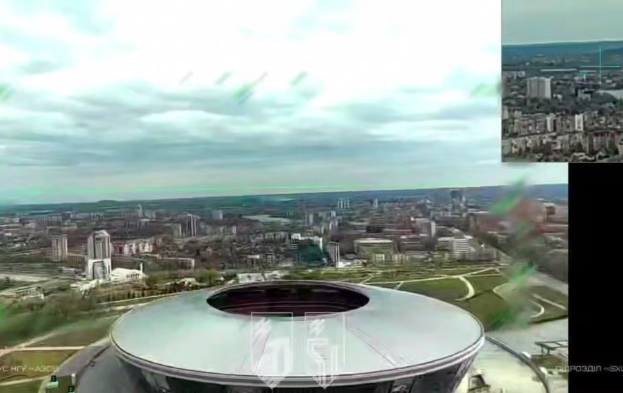 На оприлюднених кадрах видно, як українські дрони літають над Донецьком поблизу стадіона Донбас Арена.