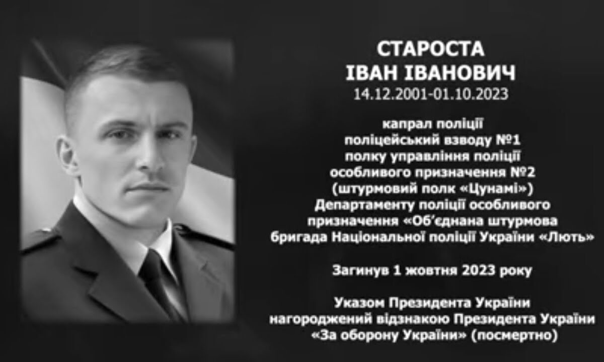 Іван Староста загинув 1 жовтня 2023 року в районі населеного пункту Курдюмівка на Донеччині під час виконання бойового завдання. Для рідних і побратимів він назавжди залишився символом мужності, відданості та сили духу. Йому був лише 21 рік. Він добровільно став до лав об’єднаної штурмової бригади Нацполіції України «Лють», щоб захищати свою країну та майбутнє власної доньки.